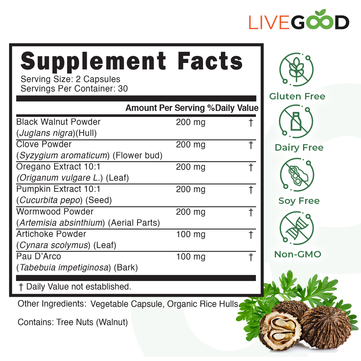 LiveGood Parasite Cleanse delivers a potent, synergistic blend of botanicals traditionally used to address every stage of the parasite life cycle — eggs, larvae, and adults — while supporting the organs that do the heavy lifting during detox.